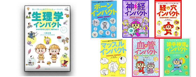 著書: マッスルインパクト ボーンインパクト 徒手検査インパクト 経穴インパクト神経インパクト 血管インパクト 生理学インパクト すべて「医道の日本社」。