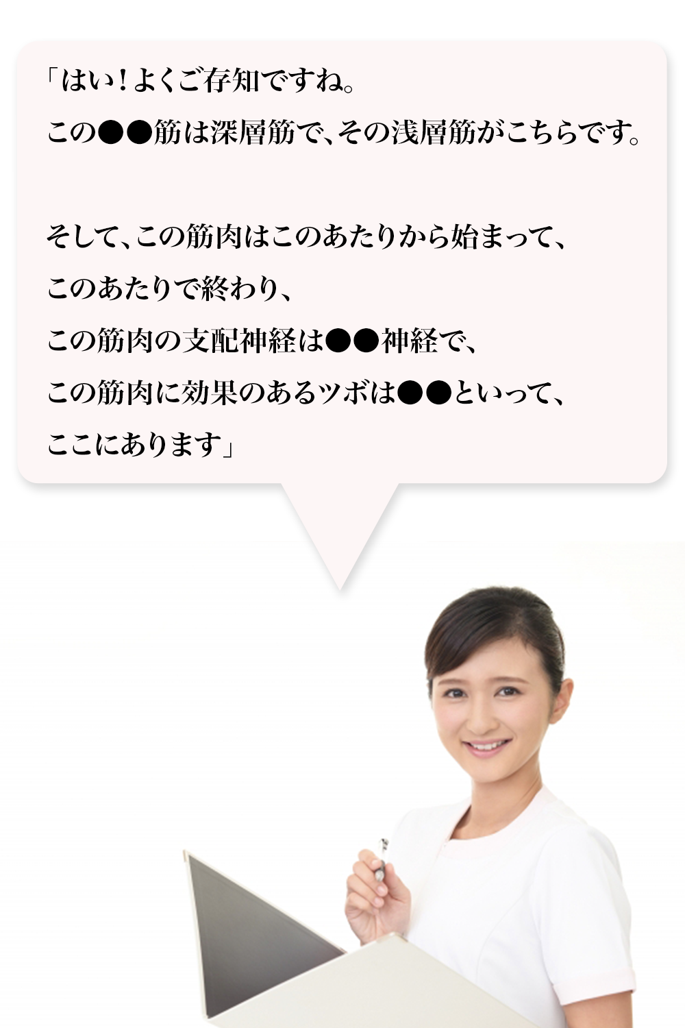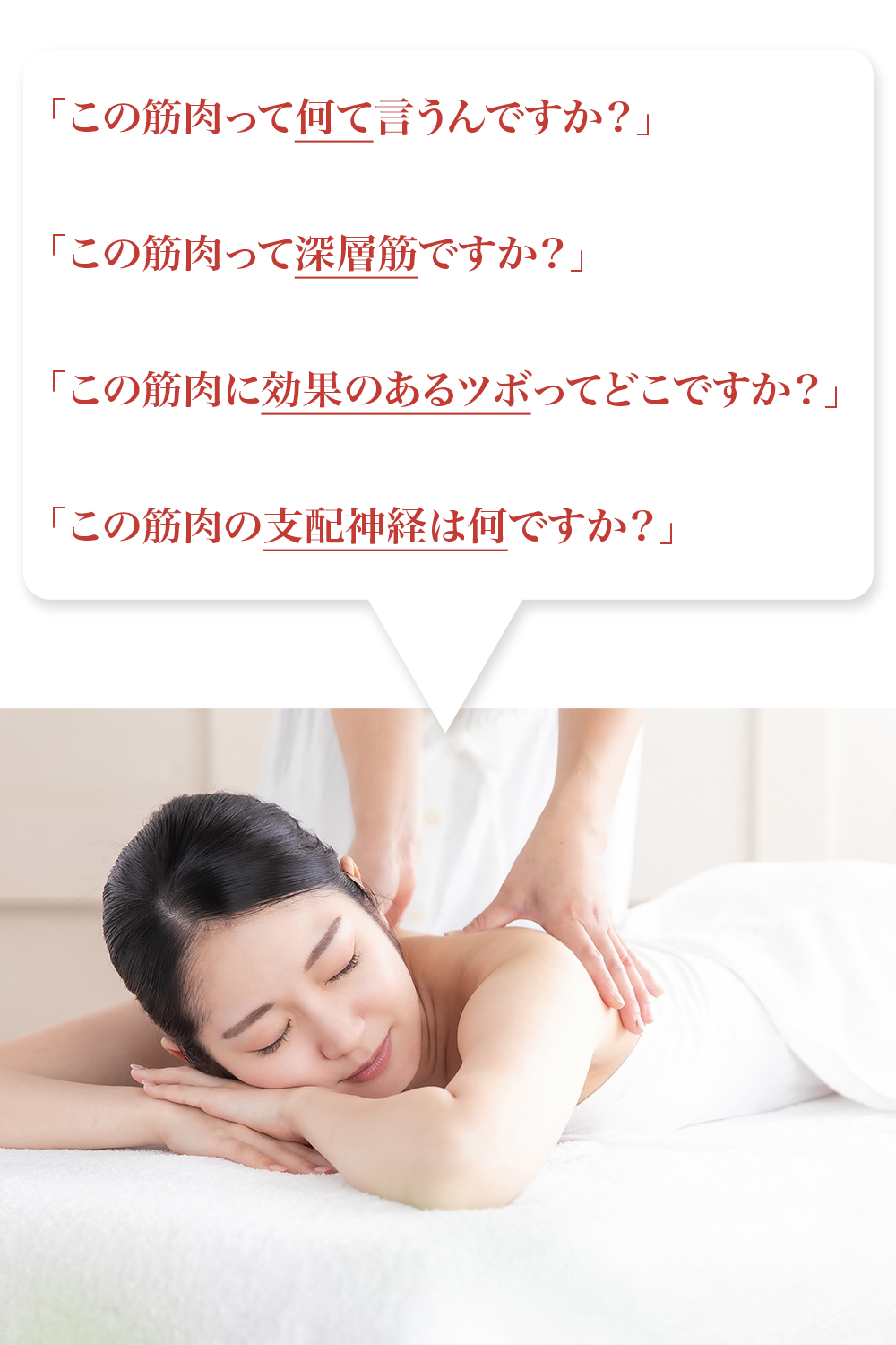 もちろん、お客さんにも自信を持って、筋肉やツボの説明、そして支配神経の説明も出来るようになるのです。